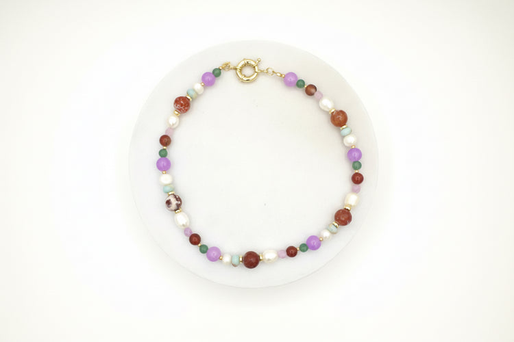 Our pieces are made with semi-precious stones, freshwater pearls, glass beads & a splash of gold. Treat them kindly and they’ll stay poppin’: